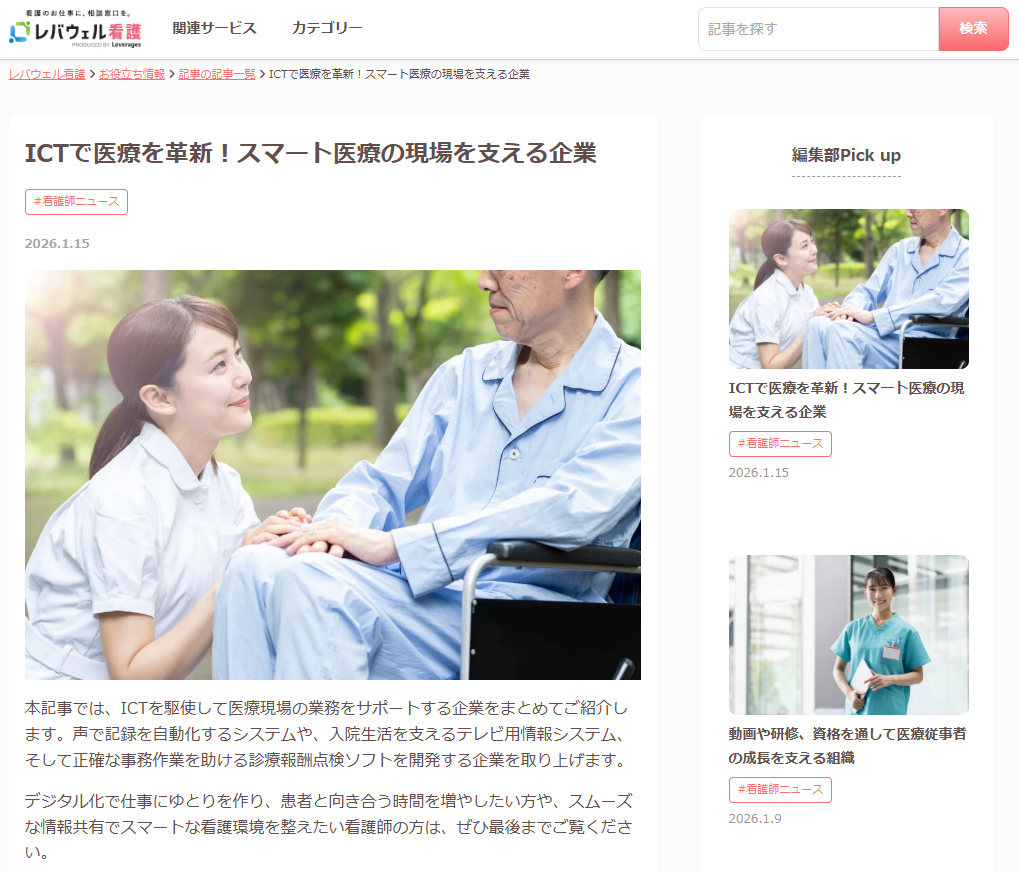 「ICTで医療を革新!スマート医療の現場を支える企業」として、看護師求人紹介サービス「レバウェル看護」に掲載されました。